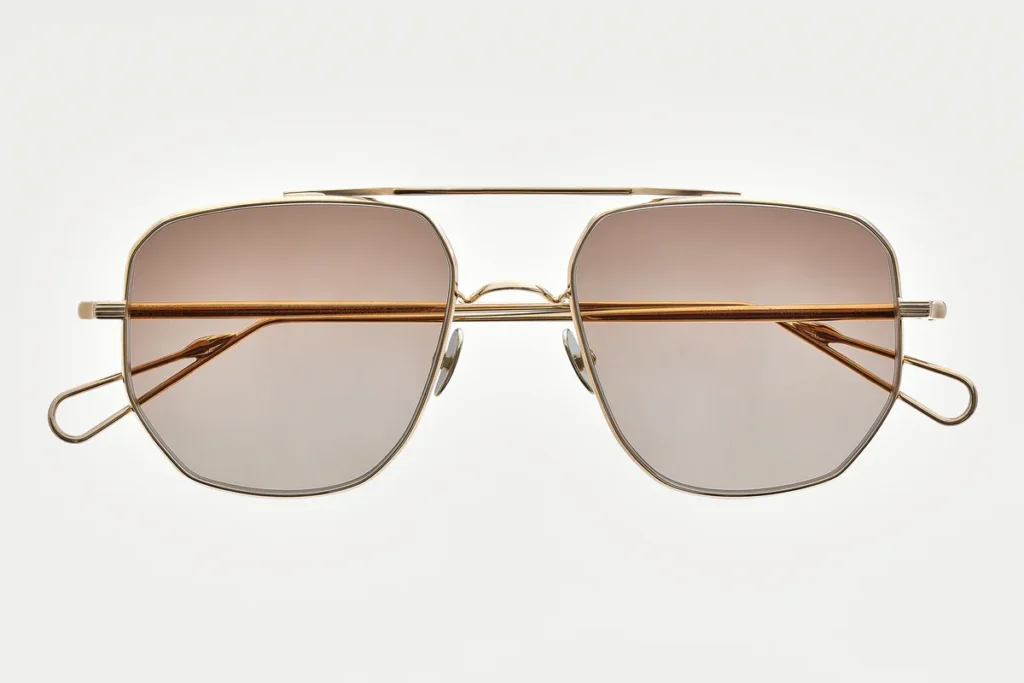 - The Metal Frame (Campbell Addy 19)Electroplated in 22K gold, this oversized silhouette is a technical and aesthetic showcase. Intricate beveling, laser-engraved filigree, and a hand-hammered brow bar emphasize craftsmanship at a granular level. Gradient brown sun lenses complete the frame, striking a balance between artistry and wearability.