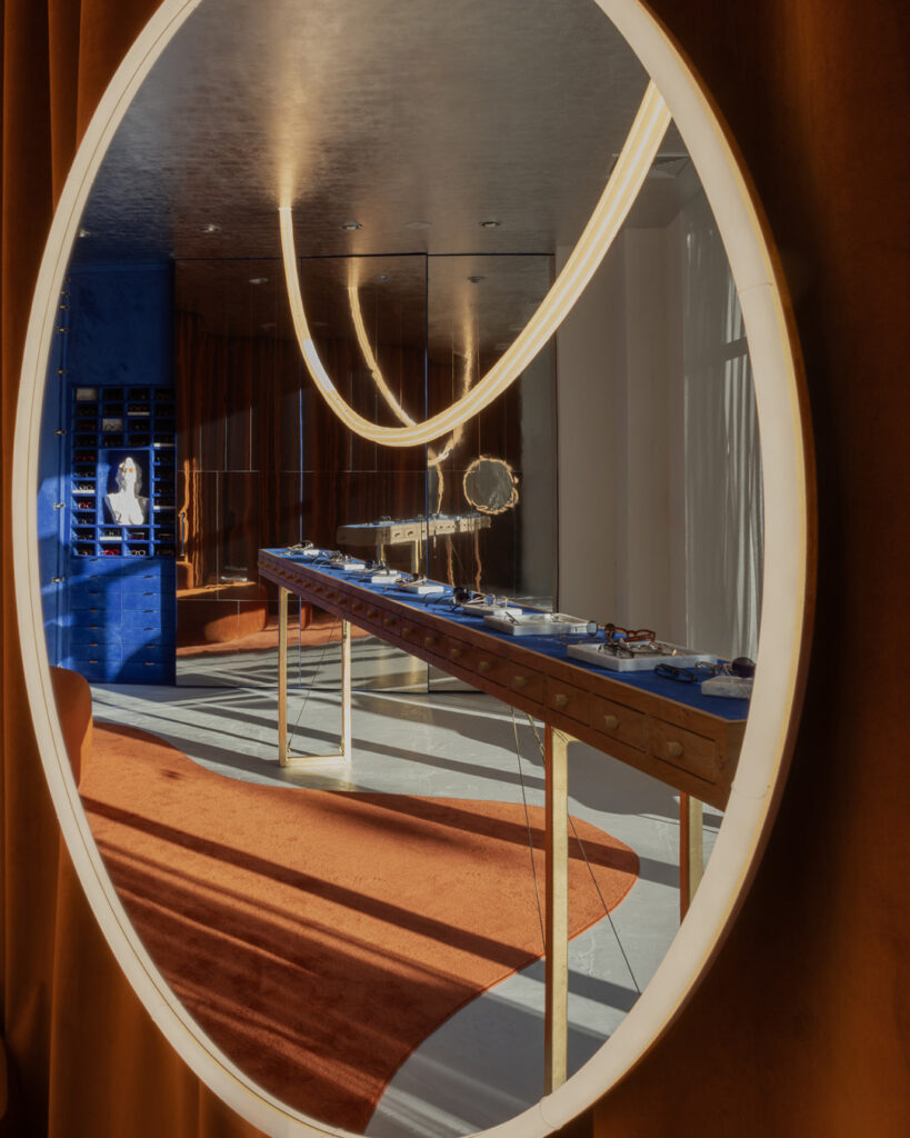 Opened by founders Magda Kośmider and Kasia Siewruk, mag.nifier has quickly charted a distinct path within the Polish visual culture scene. From the curated selection of frames to its interior architecture, the salon uses space and narrative as tools to elevate eyewear. Each element of the store’s interior was custom-designed by architect Wiktor Gago, scenographer Katarzyna Borkowska and sculptor Piotr Sobiesiak, with artisanal finishes — such as hand-applied motif work inspired by religious icon-making — that blur the line between boutique and gallery.
